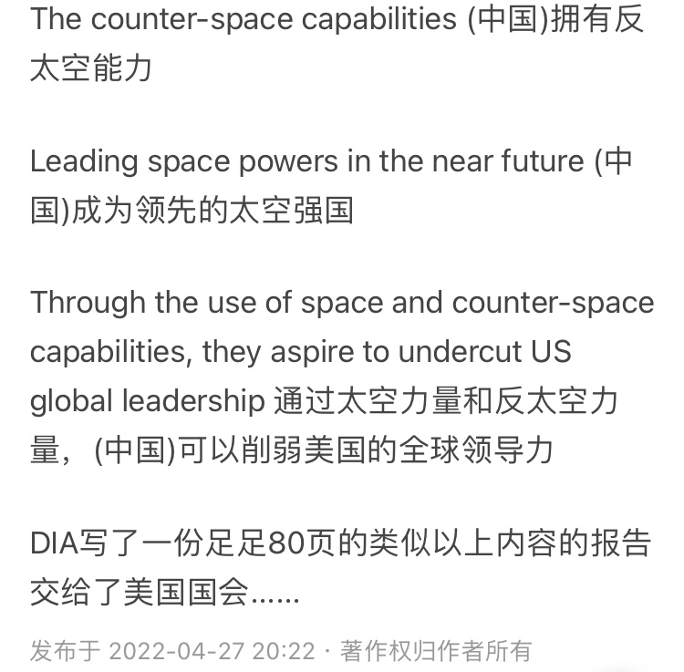 美國國防情報局和NASA最近還一起提交了一份有關中國航天的報告給美國國會。