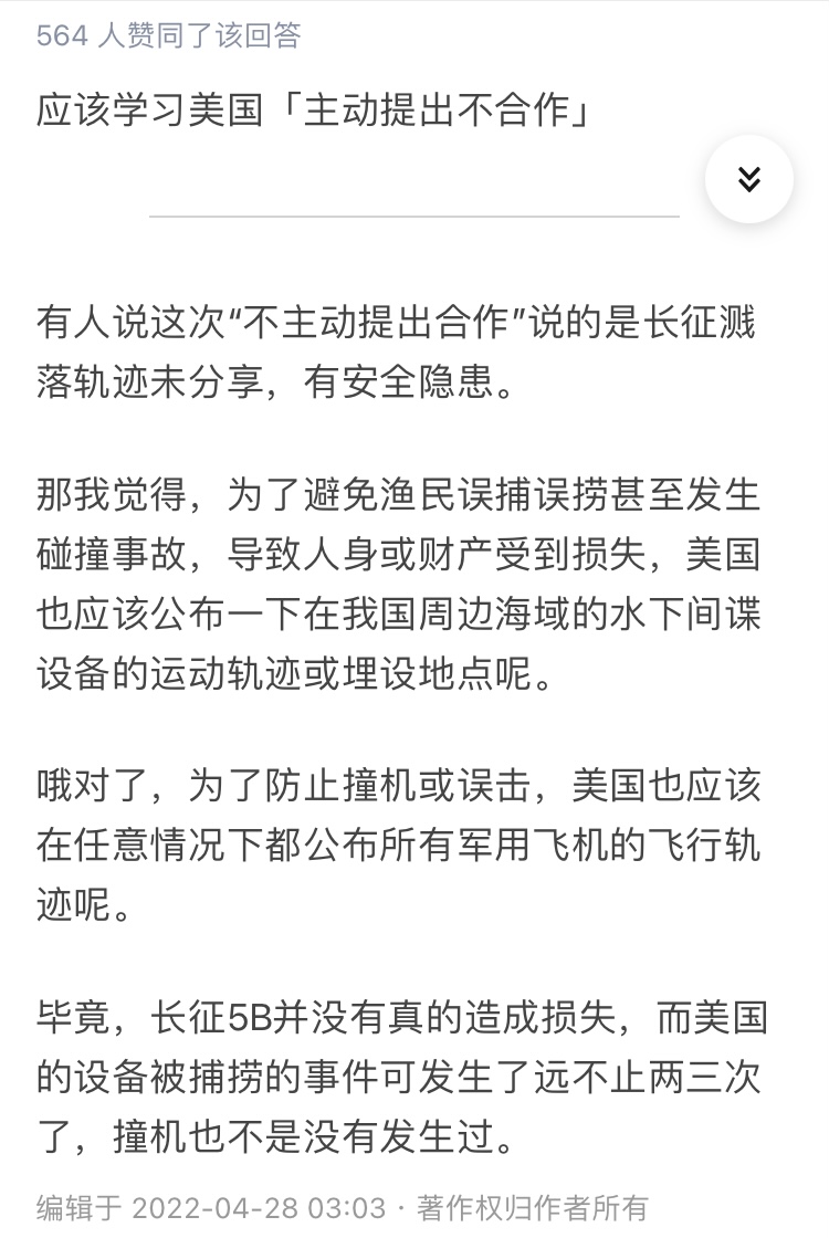 “長征5B並沒有真的造成損失,而美國的設備被捕撈的事件可發生了遠不止兩三次了,撞機也不是沒有發生過。”