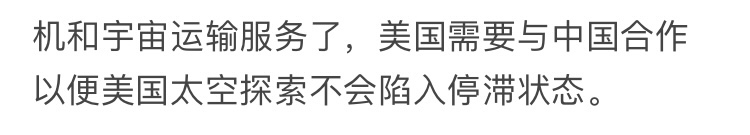 “俄羅斯已經不給美國提供航天飛機發動機和宇宙運輸服務了,美國需要與中國合作以便美國太空探索不會陷入停滯狀態。”