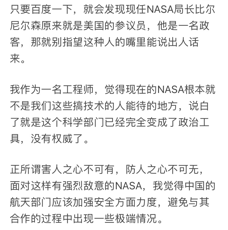 NASA局長此番言論想必有一定的目的性,為了儘可能客觀中立,我收集了各答主的回答。