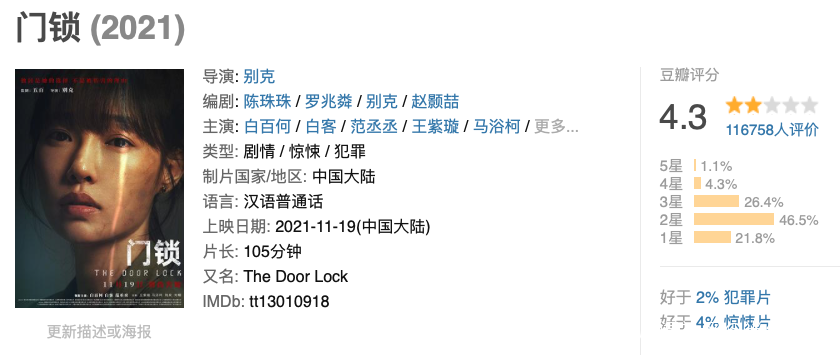 2021年的《門鎖》靠着獨居女性安全的話題,拿到了2億票房,可口碑撲街到媽不認。