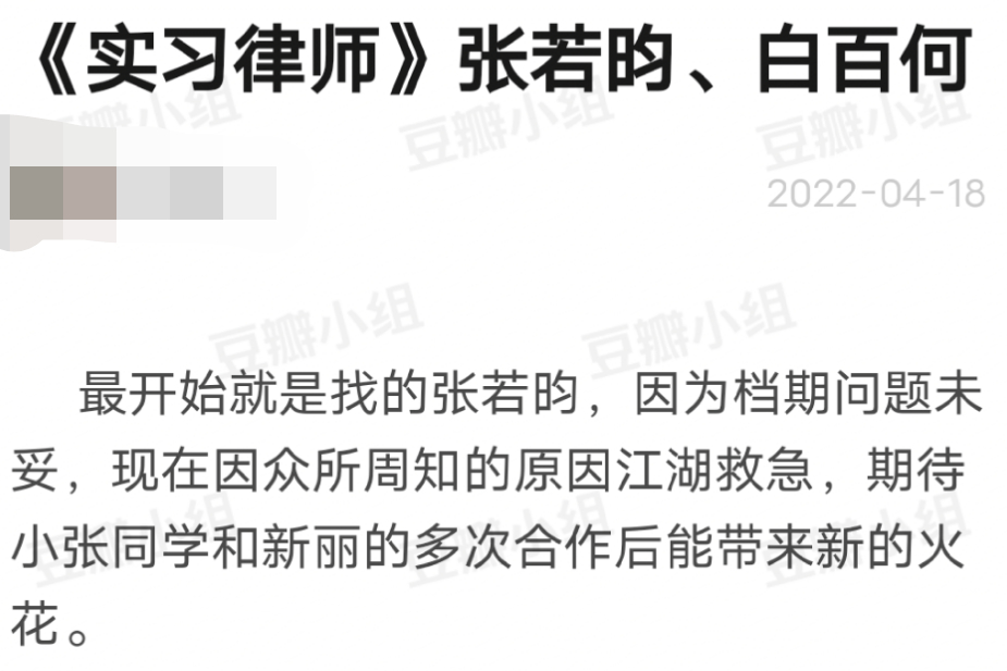 之前有爆料《實習律師》即將開機,主演是張若昀和白百何。