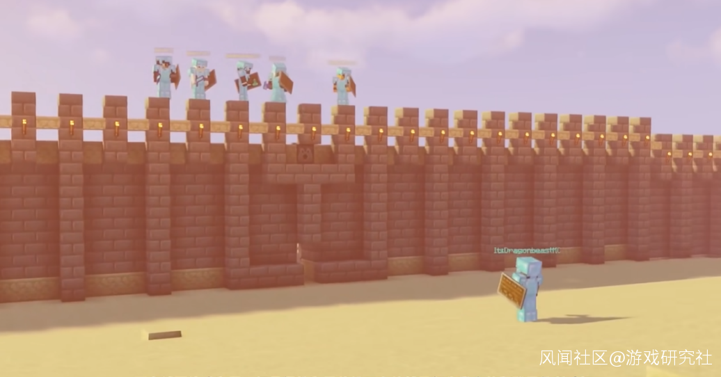 最後不堪其擾的沙漠玩家放棄了自下而上的戰術,轉而在一旁造起了更高的高台,這才成功打進了木柵欄之中。