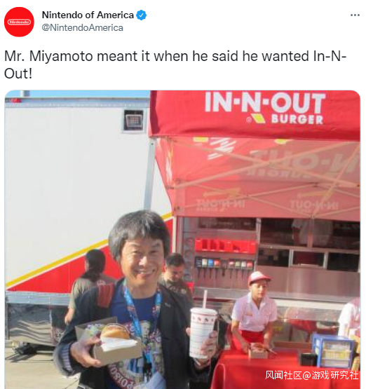 還有人挖出了9年前任天堂美國官推替漢堡達人宮本茂推薦他所喜愛的In-N-Out漢堡(快餐品牌)的推文。