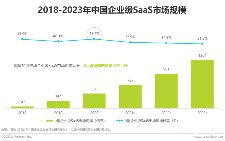 國內SaaS行業起步較晚,隨着企業數字化轉型深入,企業服務相關SaaS產品市場需求將維持較高水平的增速。根據艾瑞諮詢估計,中國企業級SaaS市場規模未來兩年的擴張將保持30%以上的增長率。