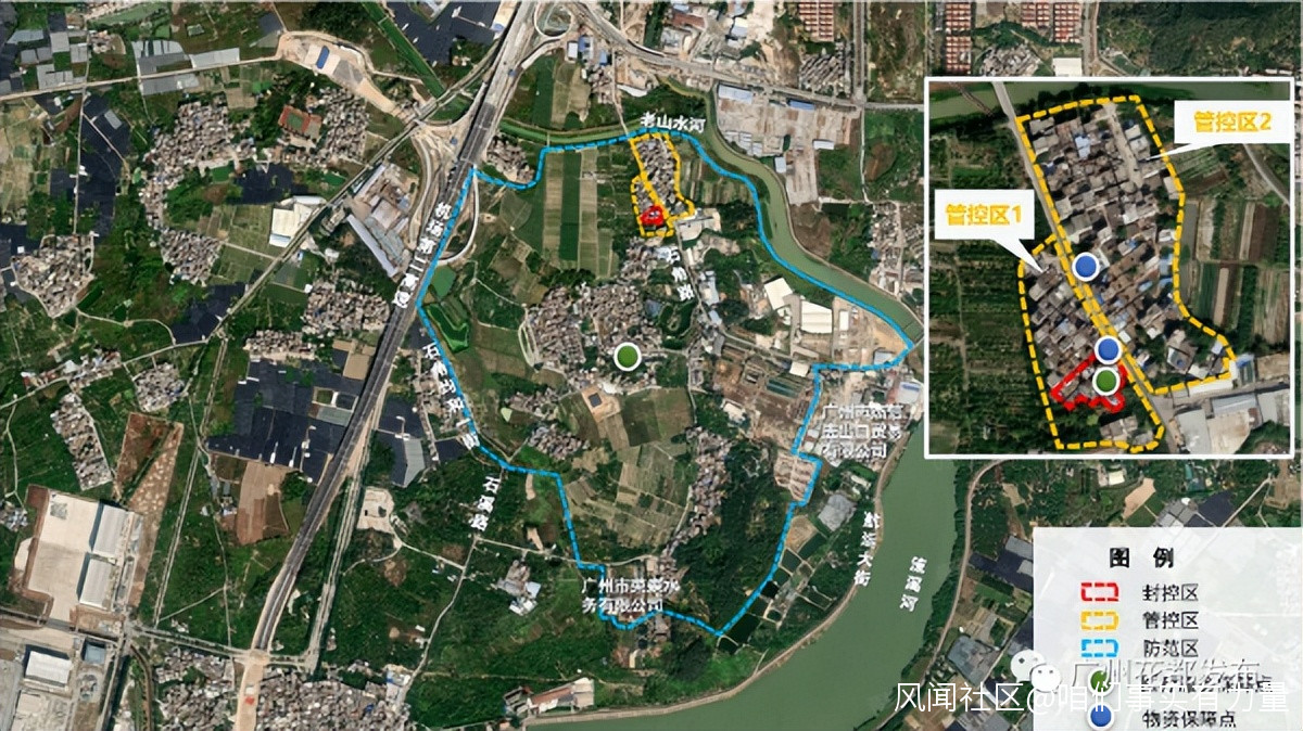 4月28日上午,根據流調結果,廣州市花都區(共4街6鎮),對兩個村(分別位於花東、花山鎮)完成設立了2個臨時管理區;至4月28日夜,根據疫情發展,對這兩個鎮劃定了封控區、管控區和防範區,如下圖: