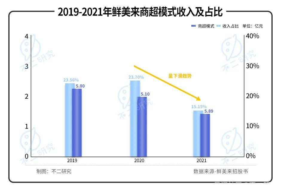 但C端市場的擴容絕非易事。招股書顯示,2019-2021年鮮美來商超模式收入佔比分別為23.56%、23.70%和15.15%,呈下滑趨勢。