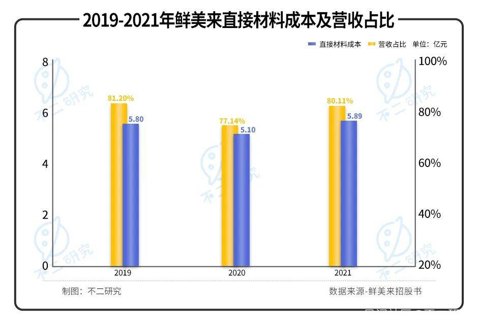 「不二研究」認為,由於鮮美來業務發展受制於上游,其毛利率很大程度上受到原材料採購費用的拖累。根據招股書,2019-2021年,鮮美來採購的直接材料分別為5.80億元、5.10億元、5.89億元,在主營業務成本中的佔比分別為81.20%、77.14%、80.11%。