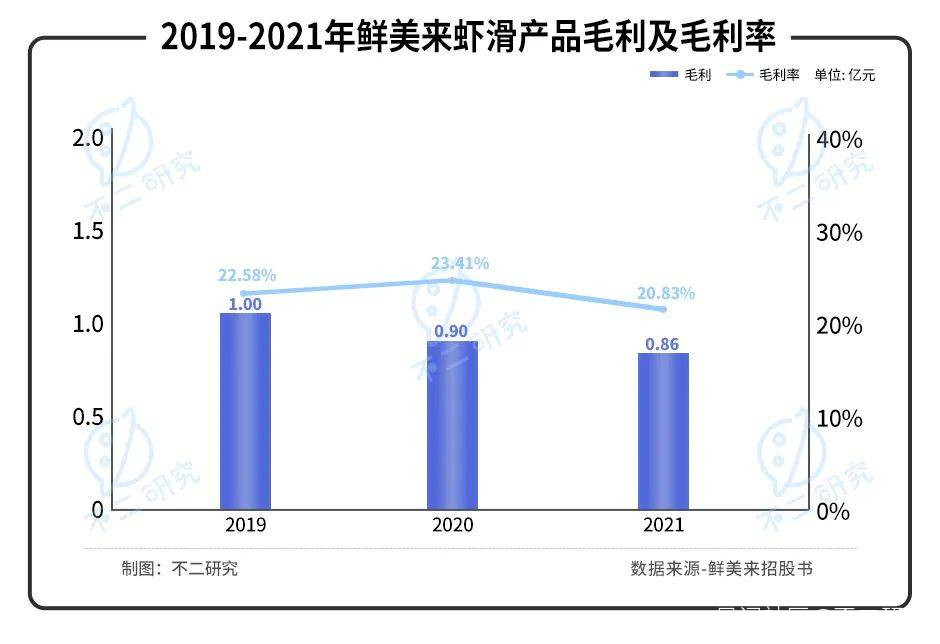 招股書顯示,2019-2021年鮮美來蝦滑的毛利率分別為22.58%、23.41%和20.83%。由於鮮美來的主要產品均為生制,相較於其他企業水煮、油炸等處理方法更為簡易,因而無法與同行競對的主營產品毛利率媲美。若持續以生制的魚蝦為基本盤,未來鮮美來的增長將遭遇“天花板”。