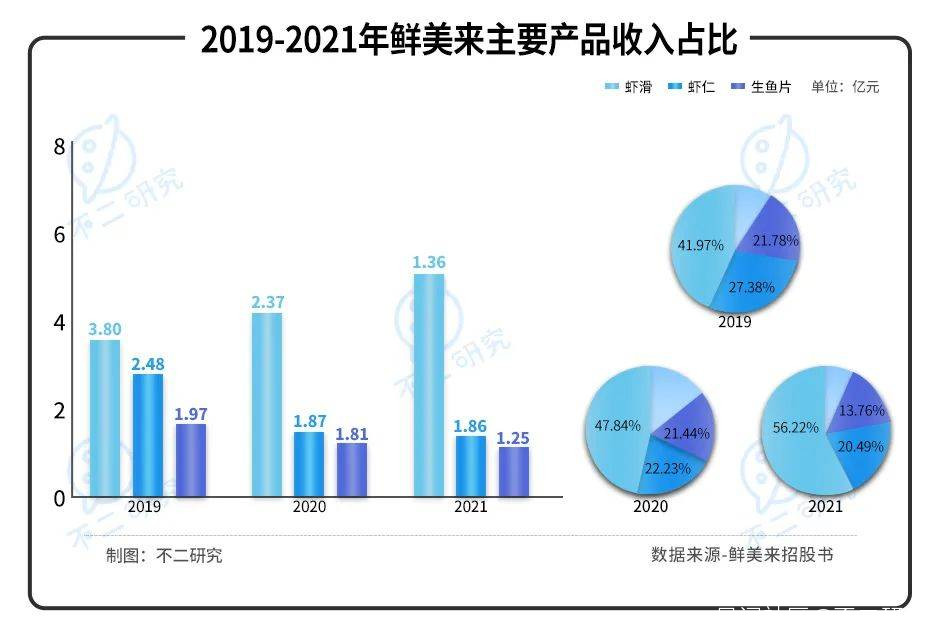 招股書顯示,鮮美來的主要產品包括兩大類:以蝦滑等為主的即烹類預製菜,以蝦仁、生魚片等為主的即配類預製菜。其中蝦滑是鮮美來的收入支柱,2019-2021年蝦滑的收入分別為3.80億元、4.03億元和5.10億元,佔比41.97%、47.84%和56.22%。蝦仁和生魚片緊隨其後,2021年分別貢獻20.49%和13.76%的收入。
