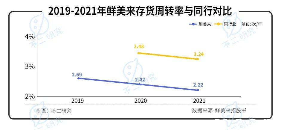 招股書顯示,2019-2021年,鮮美來的存貨週轉率分別為 2.69次/年、2.42次/年和 2.22次/年,2019-2020年行業平均存貨週轉率分別為3.24次/年和3.48次/年。同行業其他公司的產品結構更加豐富,季節性特徵弱於水產品,採購與銷售關聯更為緊密,因而存貨週轉較快。
