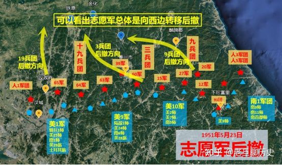 (這裏提前聲明一下,後撤中的志願軍和美軍所在位置非常混亂,圖中只能是大概示意,大家能看懂就好)
