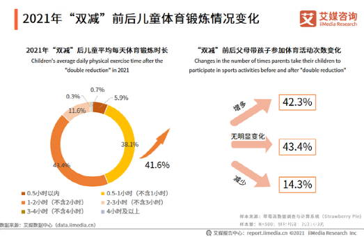 據艾媒諮詢調研數據顯示,“雙減”後,超過半數的兒童(56.0%)平均每天鍛鍊時長能夠達到1小時以上,父母帶孩子參加體育活動的次數也明顯增多(42.3%)。