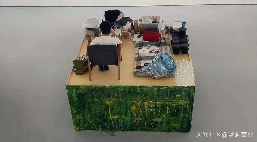 直播中,他「畫地為牢」,搭起了一個高1.2米、長寬2.5米*2.5米的台子,每日起居吃喝拉撒全在這個台子上完成,一旁是他提前準備的幾十瓶礦泉水,20多個自熱飯盒,一箱酒、一箱零食,一箱最時髦的衣服,一個沙發和馬桶。