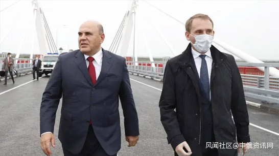 全俄國家電視廣播公司阿穆爾州分公司網站報道,米舒斯京與參與建設大橋的工人們交流,感謝工人們辛勤的勞動。這座大橋是一條強大的交通運輸大動脈,每年將可運輸200萬人次和400萬噸貨物。
