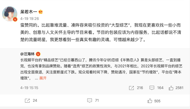 然而,時至今日,並未有任何具有討論度的綜藝出現,行業各路人士都開始表示擔憂,著名的編劇兼製片人汪海林稱“長視頻平台的精品綜藝已經日暮西山了”,朋友圈看見有從業者感嘆,平台忙着漲價拯救頹勢,要變天了。