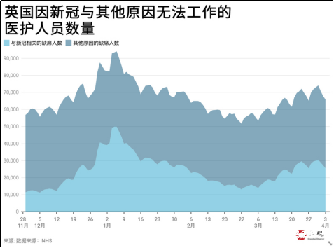 另外因為英國放開管控,大量醫護人員感染新冠病毒,導致缺勤醫護大範圍增加,日均缺勤醫護高達數萬人。