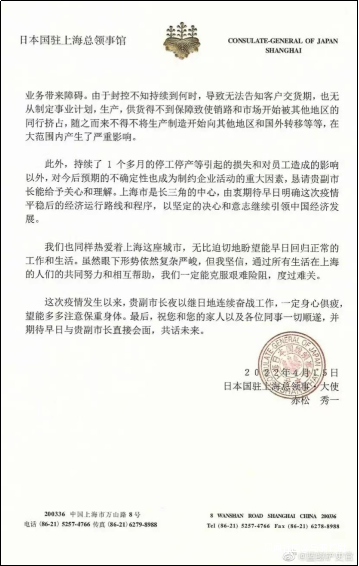 上海市的疫情封控給一萬多家日資企業造成了巨大的損失,這些企業都快頂不住了,我們希望你們可以儘快解除封控!