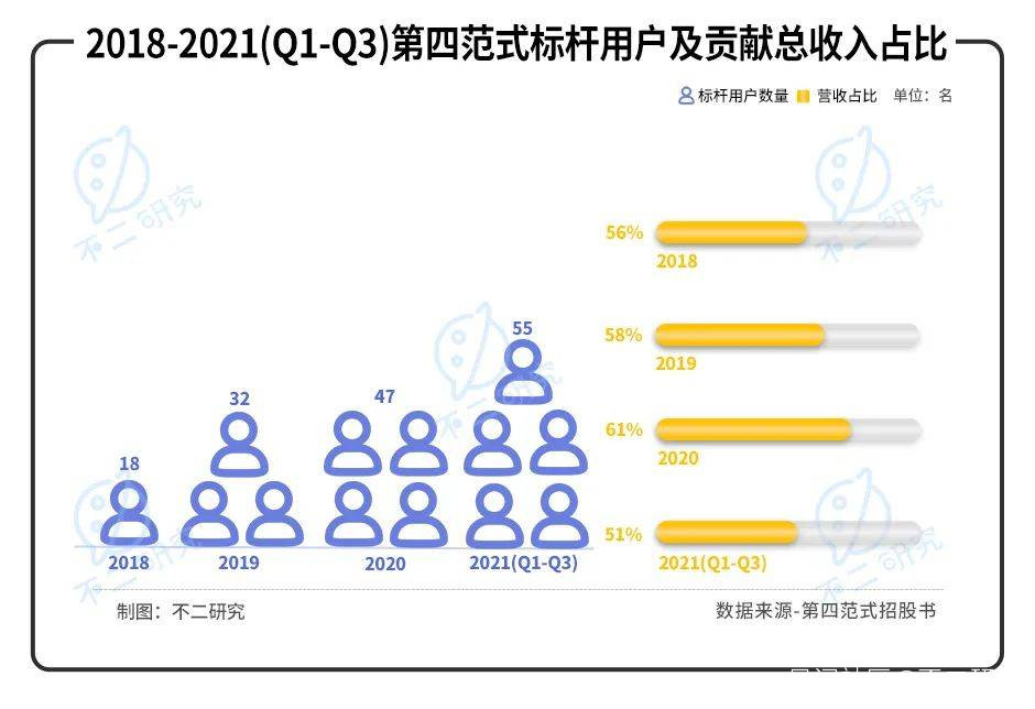 同期,第四範式分別服務18名、32名、47名及55名標杆用户;標杆用户收入分別貢獻總收入的56%、58%、61%及51%。近四年內,標杆用户的營收佔比過半。
