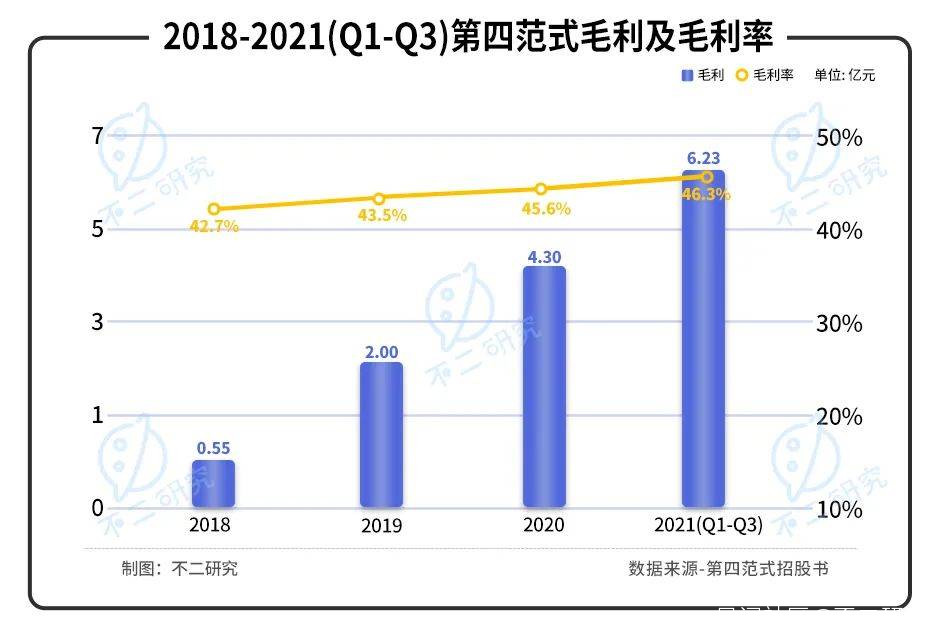 2018年~2021前三季度年,其營收分別為1.28億元、4.6億元、9.42億元、13.45億元;同期的毛利分別為0.55億元、2.00億元、4.3億元、6.23億元。