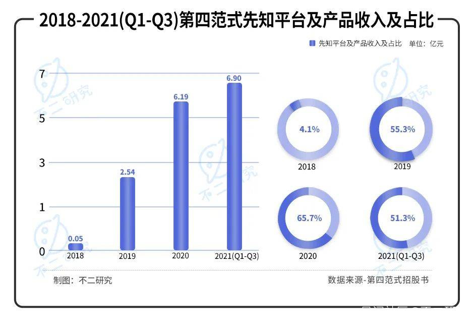 2018~2020年以及2021年前三季度,其先知平台及產品收入分別為分別為523萬元、2.54億元、6.19億元和6.90億元,佔總收入的4.1%、55.3%、65.7%和51.3%。