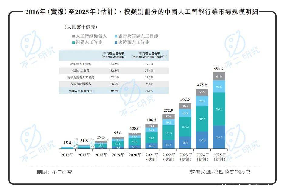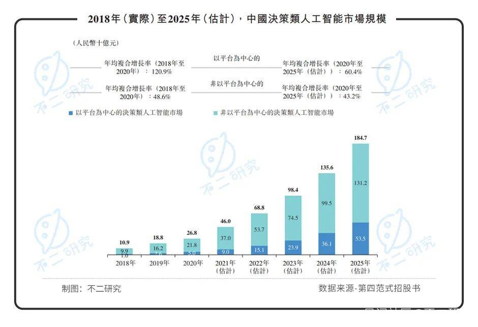 灼識諮詢報告顯示,2020年,中國決策類人工智能市場的支出規達到268億元,預計2025年將增長至1847億元,年均複合增長率為47.1%;高於視覺類、語音類和機器人的年複合增長率預期,後三者分別為36.4%、33.2%和23.8%。