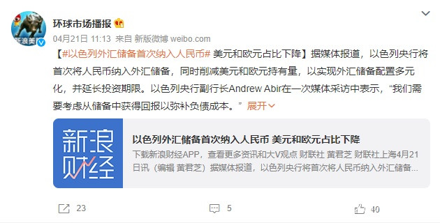 中東最最抱美軍大腿的以色列,現在也在開始調整國家財富結構了,以前囤美元、歐元,現在也要多元化了,人民幣已經納入外匯儲備裏了。