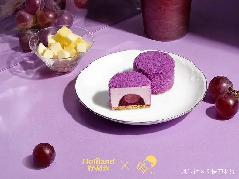 2019年10月,好利來與喜茶聯名推出“多肉葡萄雪絨芝士”等多款新品,全系列產品帶來超74萬件、410萬枚的火爆銷量,好利來出盡風頭。