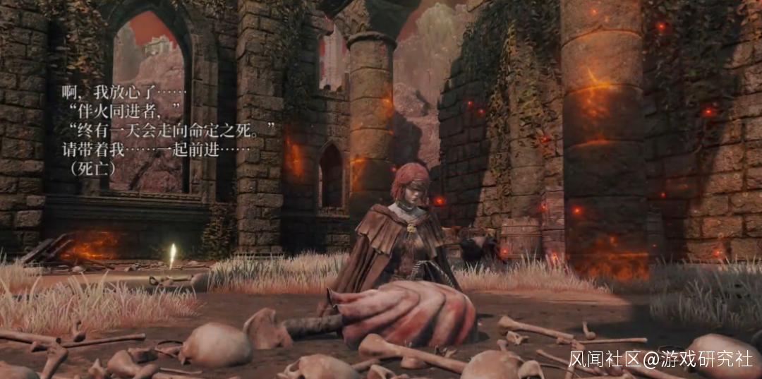 在我理解裏,這段話是一種雙關,一重代表了褪色者伴隨火種同行,最後會遇見死之盧恩,另一重代表了火種少女身懷火焰前行,最後的命運就是做出犧牲,迎來死亡。