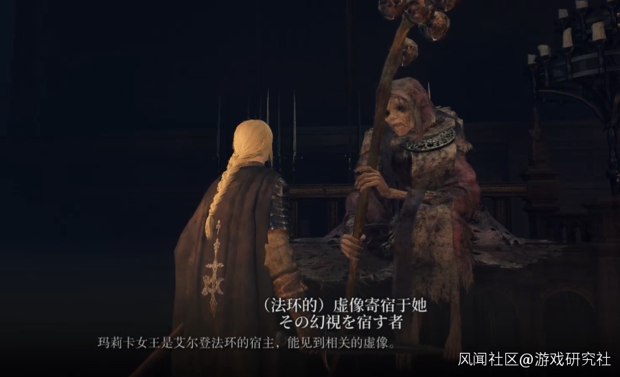 瑪莉卡女王是艾爾登法環的宿主,能見到相關的虛像(その幻視を宿す者)。