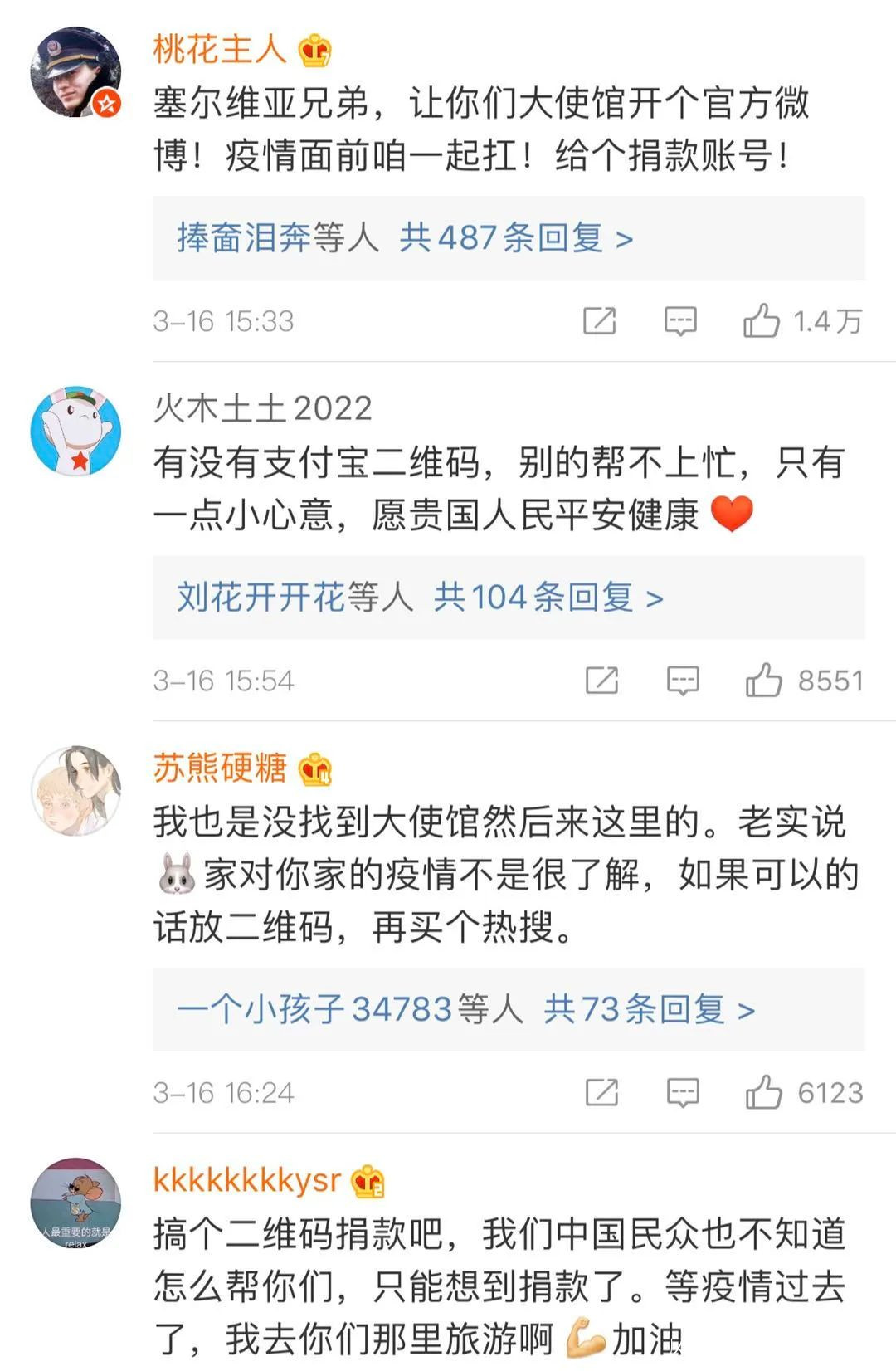 塞爾維亞總統幾近落淚的求助,也感動了中國網友,大家都跑到@塞爾維亞國家旅遊局的微博下,希望他們留一個捐款方式。