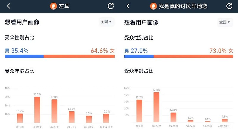 以2015年上映的《左耳》和剛剛上映的《我是真的討厭異地戀》作對比,根據燈塔專業版的想看人羣畫像顯示,二者的女性用户佔比分別為64.6%和73%;24歲以下用户佔比分別為66.4%和76.5%;三線及三線以下城市佔比為33.6%和46.3%。女性、學生黨、下沉市場,幾乎每個維度都有約十個百分比的上升幅度。