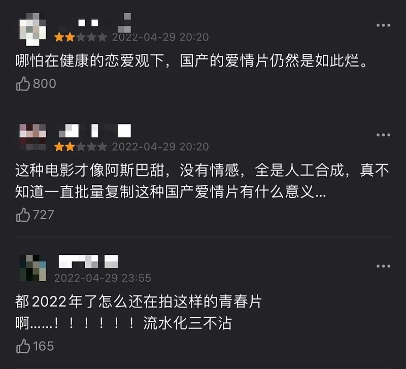 令人不明就裏的是,影片至今豆瓣仍未開分。打開豆瓣短評,排名前列的熱評留下了疑惑,“真不知道一直批量複製這種國產愛情片有什麼意義…”