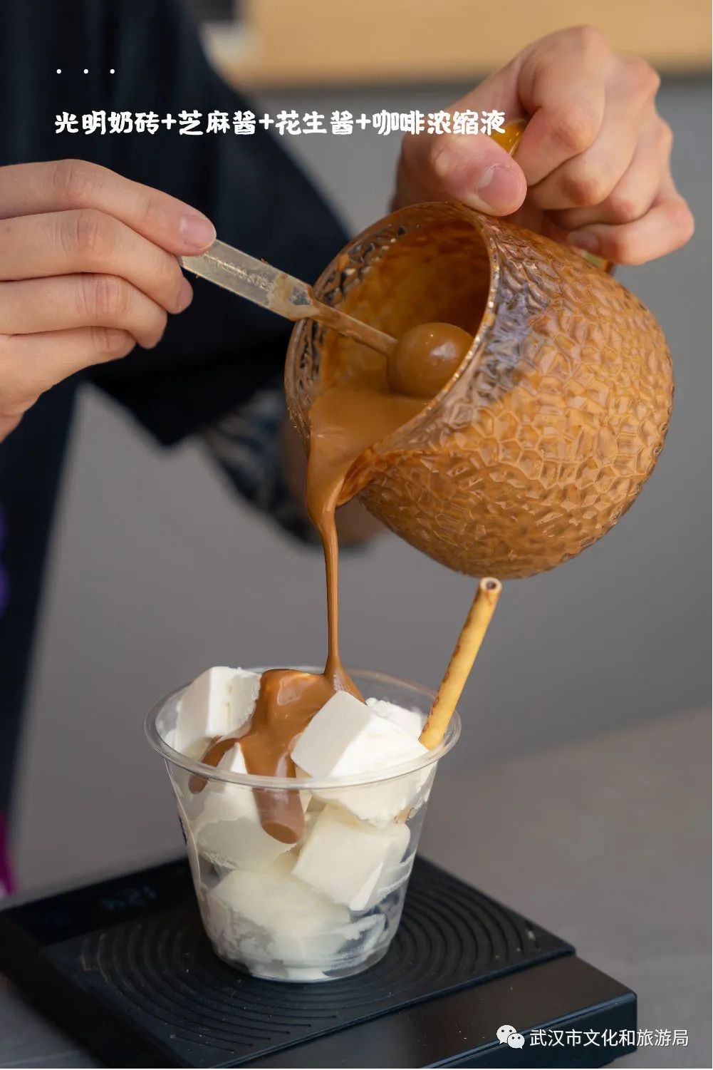 幾個白白的小方塊打底,是大家熟悉的光明奶磚,然後,澆上特調的“熱幹醬”。這是芝麻醬+花生醬+咖啡濃縮結合,口感很醇卻不膩,搭配着吃,味道特像花生酥。