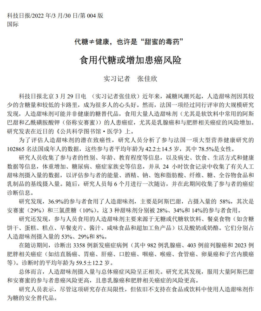 這則科技日報在2022年3月30日第004版刊登的《食用代糖或增加患癌風險》表示,