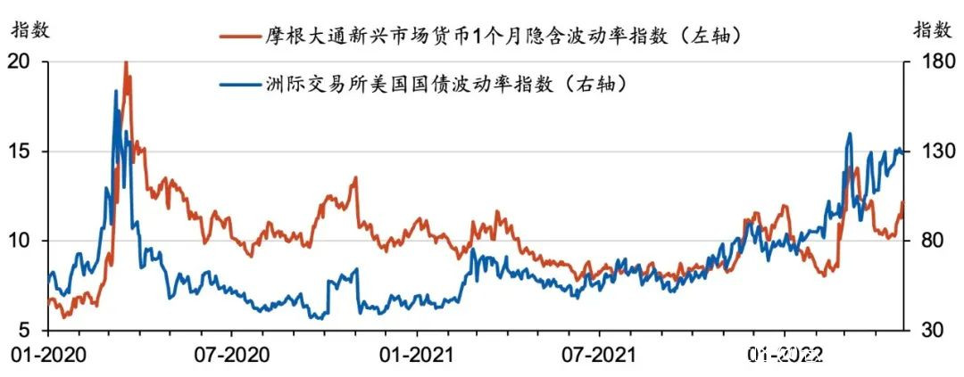 圖7:ICE美國國債波動率指數(MOVE)和摩根大通新興市場貨幣1個月隱含波動率指數