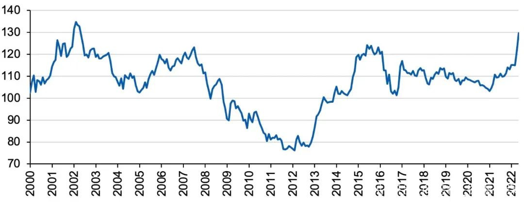 銅、鋁、天然氣、小麥等多種大宗商品價格創歷史新高,其中歐洲天然氣價格在過去一年內最高漲幅超過17倍,原油的12個月遠期折價一度超過歷史6倍標準差;美元指數升至20年新高,日元一改“避險貨幣”的特性,兑美元匯率在過去兩個月貶值超過10%,達到20年新低,土耳其里拉、俄羅斯盧布、印度盧比、巴西雷亞爾、智利比索、阿根廷比索等一批新興市場貨幣對美元匯率皆創歷史新低;美國10年期國債收益率升至4年新高,德國10年期國債收益率升至7年新高,英國2年期國債收益率升至10年新高……