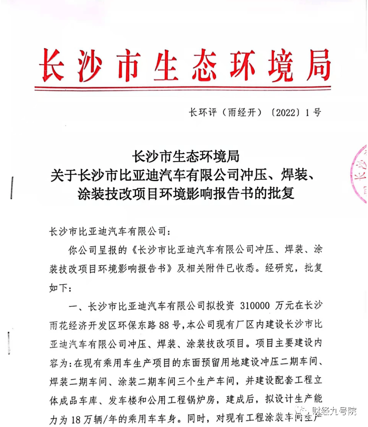 值得注意的是,在今年2月份長沙市生態環境局對《比亞迪長沙公司衝壓、焊裝、塗裝技改項目環境影響報告書》的批覆文件顯示,其中有要求比亞迪長沙公司“嚴格落實大氣污染防治措施”。