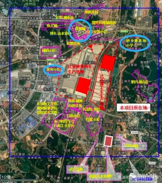 作者看了比亞迪長沙工廠的地圖,發現很詫異,為何這樣一座大型生產基地,坐落於周圍密集的居民區和學校之間?