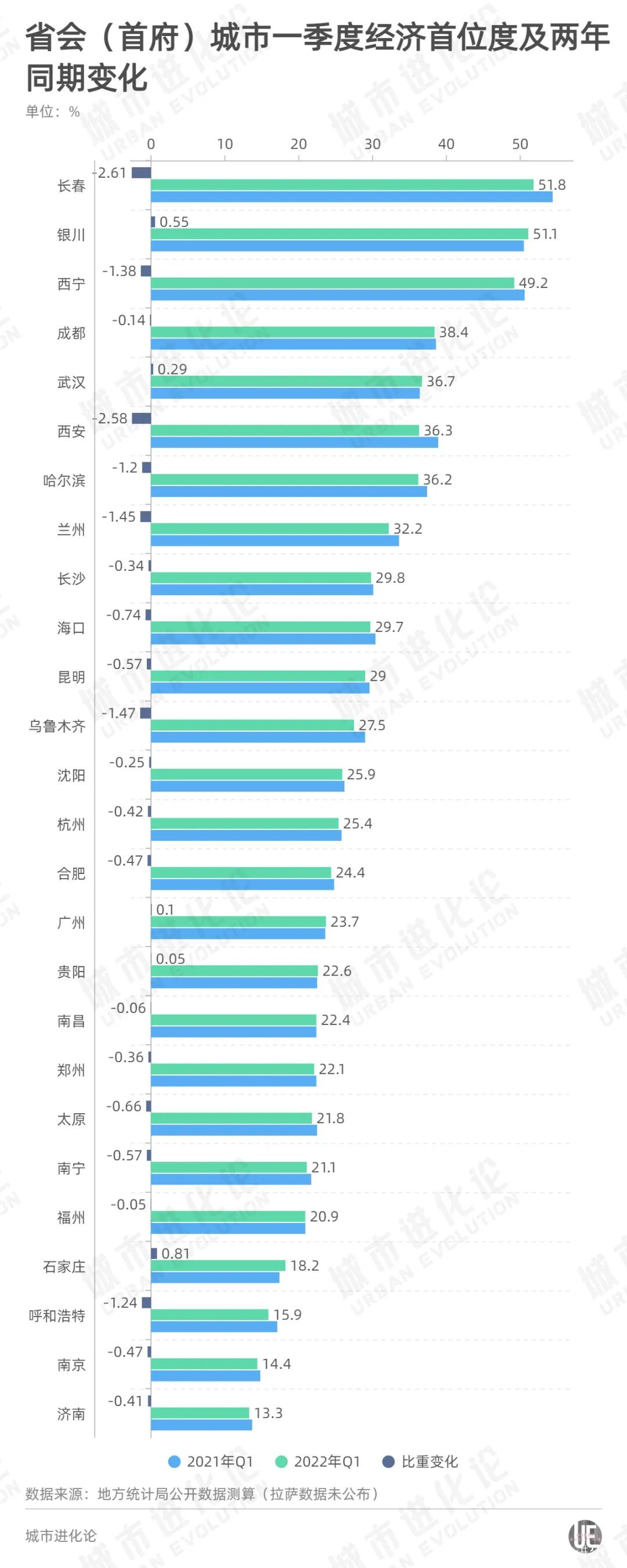 今年一季度,已公佈數據的26個省會城市中,共有8個經濟首位度超過30%,分別是長春、銀川、西寧、成都、武漢、西安、哈爾濱和蘭州。此外,濟南、南京、石家莊、呼和浩特等4城首位度低於20%。