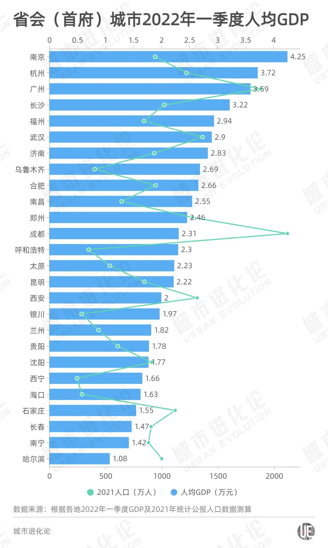 從今年一季度最新數據看,26個省會城市中,4城人均GDP超三萬元,分別是南京、杭州、廣州和長沙,這其中南京一季度人均GDP超過4萬元,達到4.25萬元;其餘22個省會城市一季度人均GDP均在1~3萬元之間。