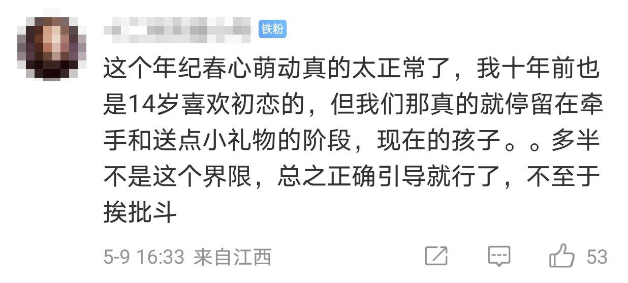 而很多網友也表示在14歲的時候談戀愛也很正常,很多人以前也曾有早戀過,只是不算特別開放,基本僅限於牽手或者是傳小紙條。