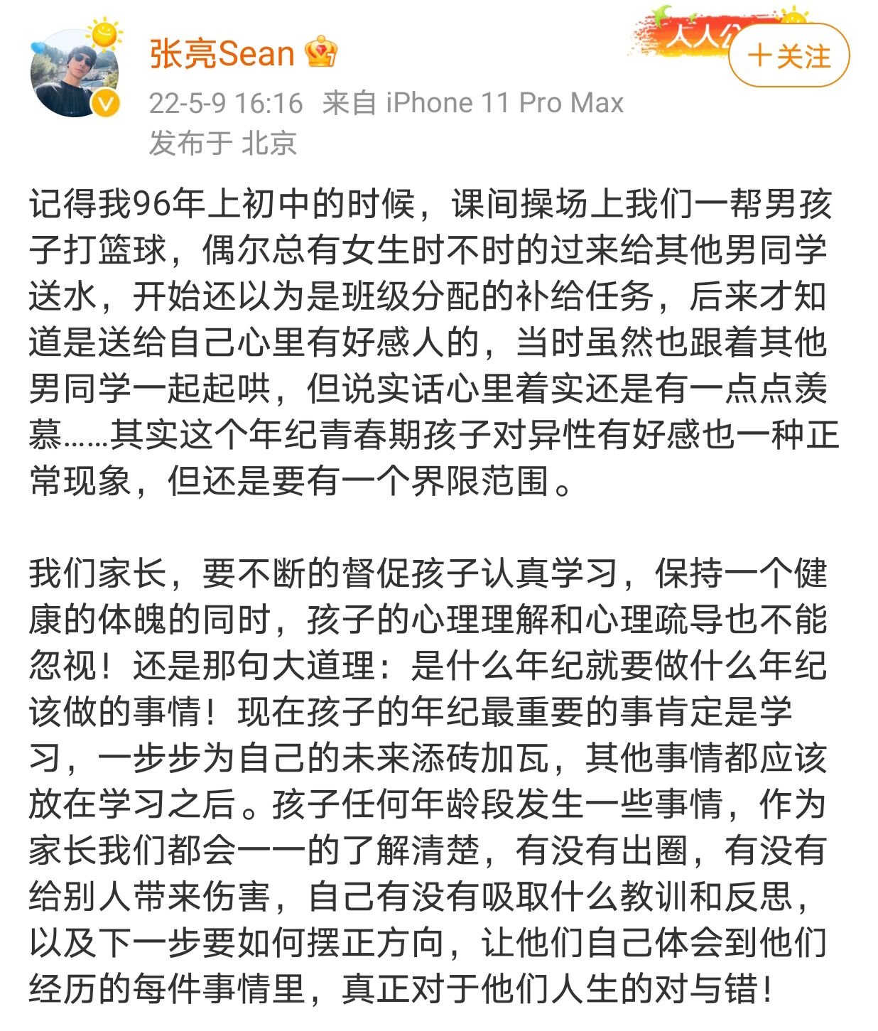 而今天,身為父親的張亮也發文回應,稱談戀愛這個對於身處青春期的孩子來説是很正常的事情,家長應該在這個時候督促孩子,並通過心裏輔導來讓孩子理解和接受,而不是通過一位責罵來讓其只是嘴上暫時“服軟”。