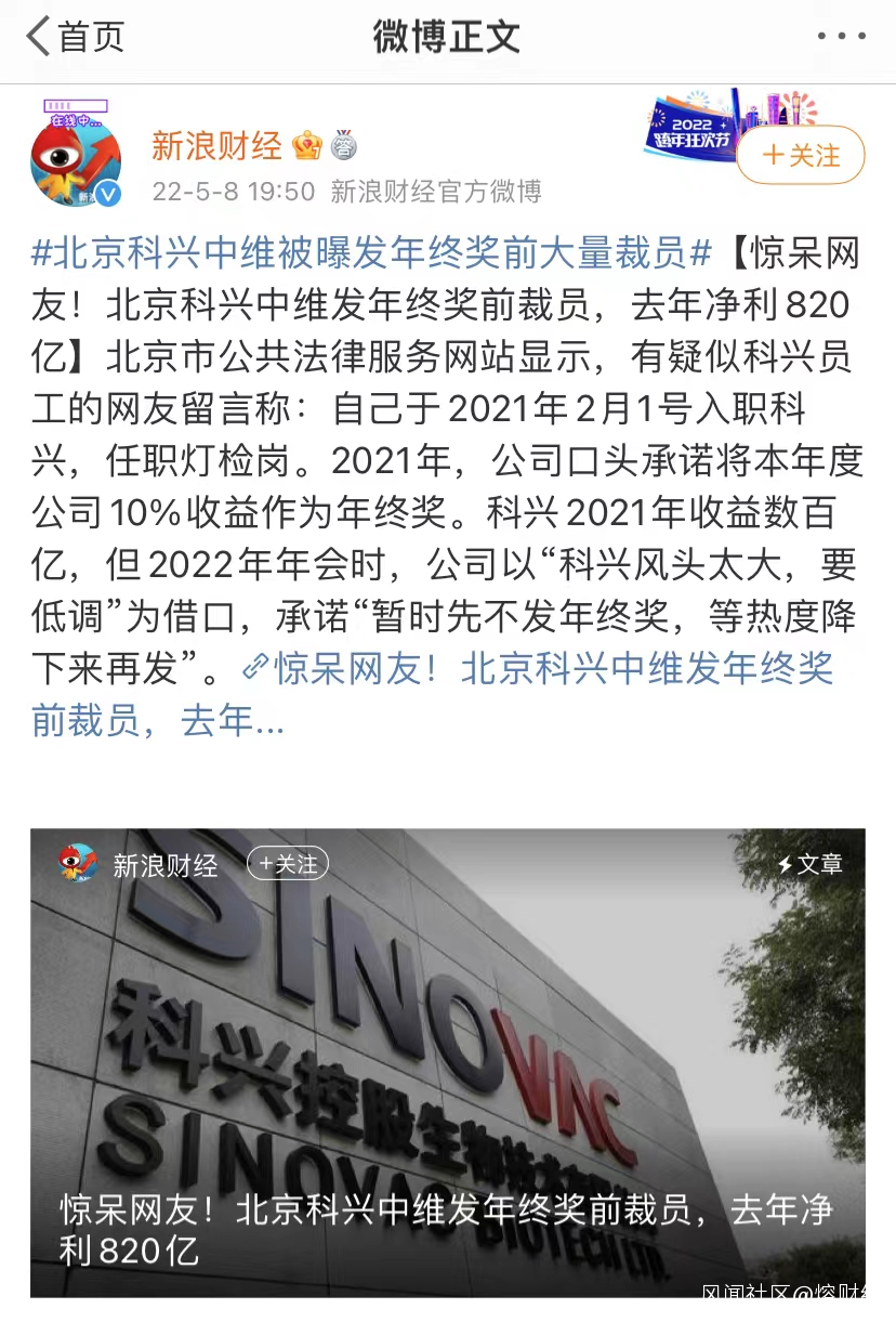 “財通社”在文章《驚呆網友!北京科興中維發年終獎前裁員,去年淨利820億》中提到,“有媒體報道,按照70%的裁員範圍來看,涉及員工至多不過7000人,即便給這7000人每人都發放10萬塊錢的年終獎,累計成本也不過7億元。”