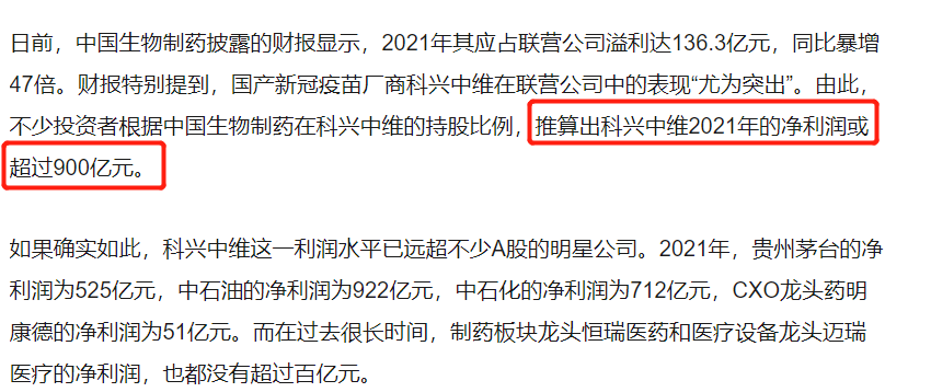 開頭提到的科興中維,據“觀網財經”發佈的《新冠疫苗放量供貨,科興中維去年或淨賺超900億》中的表述,“根據業內投資者按科興中維股權比例進行的推算,科興中維2021年的盈利約在900億元之上。”