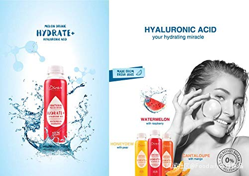 歐洲知名飲料品牌Diva’s專注於女性飲料的開發,其推出的Hydrating Drink系列飲料,選用3種強效保濕的瓜果汁,結合天然保濕劑透明質酸,通過維生素、抗氧化劑及電解質的加成,具有良好的水合作用,滿足女性的補水保濕訴求。