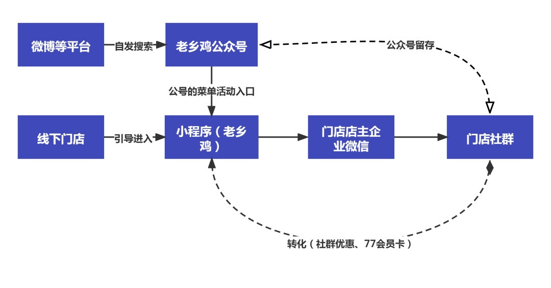 比如,老鄉雞的私域運營系統,目的是將流量導入到老鄉雞的流量池中,實現品牌流量留存和變現的穩定性。系統要素包括公域的流量平台(微博、線下門店)、轉化平台(公眾號、小程序)和流量承載平台(企業微信和微信羣),鏈接分別是新媒體團隊、線下門店的店長和工作人員、社羣的運營人員。