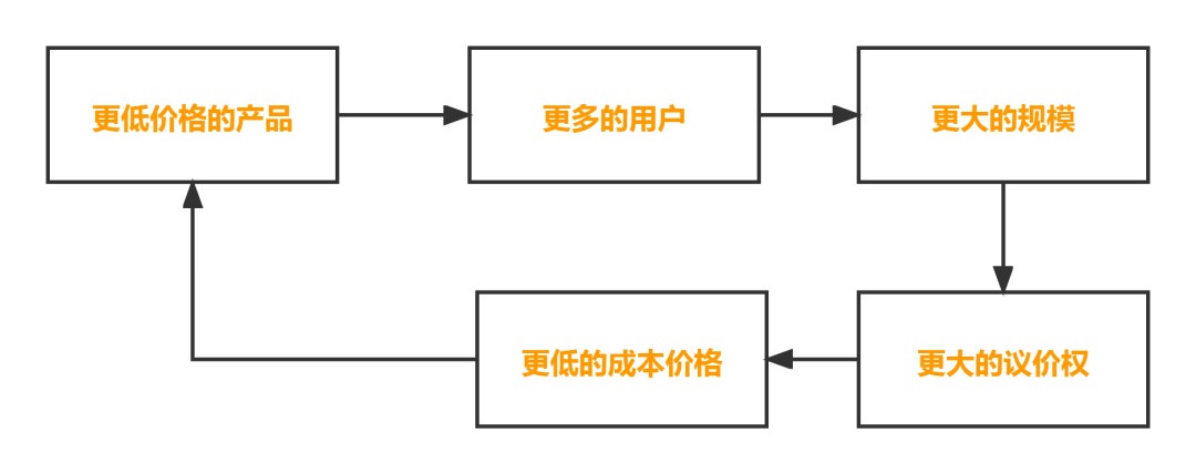 蜜雪冰城的戰略目標是低成本領先。為實現這目標,它搭建並運營了一個增長系統,先用低成本的產品,換取海量的顧客,實現規模化;有了規模化,再提高自己在原料採購端的的議價權;有了議價權,再加大對成本結構的優化,進而再降低產品的價格,進一步搶佔市場。