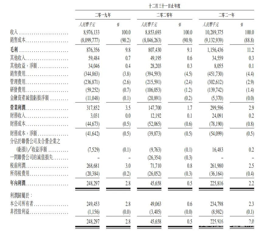 低毛利率一直是百果園發展難以逾越的屏障。招股書顯示,2019-2021年,百果園的毛利分別為8.76億元、8.07億元與11.56億元,毛利率分別為9.8%、9.1%及11.2%。同期淨利潤分別為2.49億元、0.49億元與2.35億元,淨利潤率分別為2.8%、0.5%及2.2%。業內人士認為,百果園做的還是流通生意,這是鏈條中利潤率最低的部分。招股書顯示,2019-2021年,百果園的銷售總成本分別高達81.00億元、80.46億元和91.33億元,佔總營收的90.2%、90.9%和88.8%。其中,已出售存貨成本分別佔銷售成本的96.2%、95.2%及95.3%,已出售存貨成本(主要為採購成本)居高不下制約了其毛利率的提升。