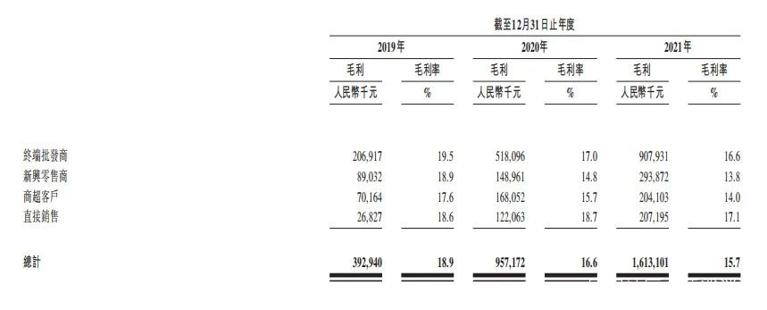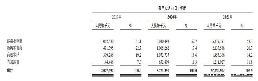 與百果園直接面向消費者不同,洪九果品的渠道主要有四種,即終端批發商、新興零售商、商超客户、直接銷售。其中,終端批發商一直是洪九果品的最大渠道,2019-2021年,終端批發商的銷售佔比分別為51.1%、52.7%、53.3%,而得益於近年來社區團購和即時電商的興起,新興零售商對洪九果品的收入貢獻越來越大,2019-2021年,新興零售商銷售佔比分別為22.7%、17.4%、20.7%。